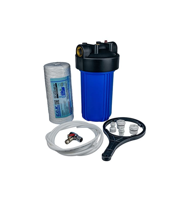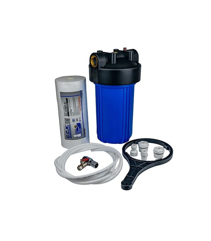 Διαθέτει μία φιλτροθήκη Big Blue 10″ με θηλυκά ορειχάλκινα σπειρώματα 1″ στην κεφαλή και κουμπί απελευθέρωσης της πίεσης.
