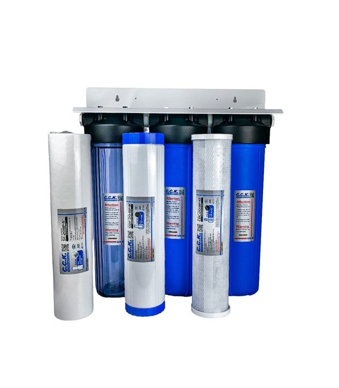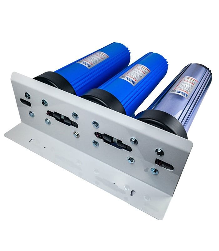 Διαθέτει τρεις φιλτροθήκες Big Blue 20″ με κουμπί απελευθέρωσης της πίεσης.