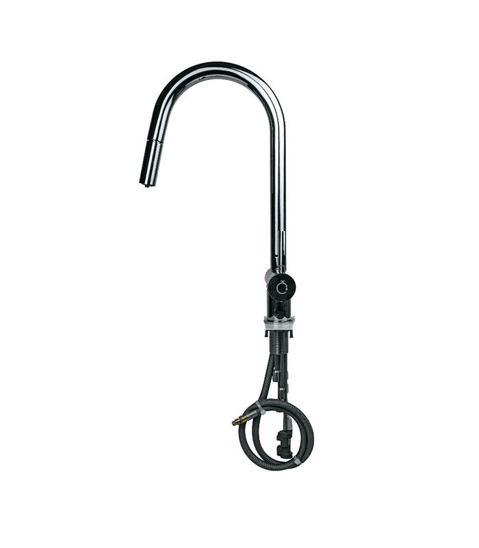 Η τρίοδη βρύση PULLOUT CURVE CHROME είναι μια βρύση με κομψό και κλασικό σχεδιασμό. Σε αντίθεση με τις κανονικές μπαταρίες κουζίνας διαθέτει δύο ξεχωριστά εσωτερικά κανάλια παροχής νερού. Τα δύο αυτά κανάλια σας δίνουν τη δυνατότητα να έχετε από την ίδια βρύση, αλλά ξεχωριστές εξόδους, και αφιλτράριστο και φιλτραρισμένο νερό.